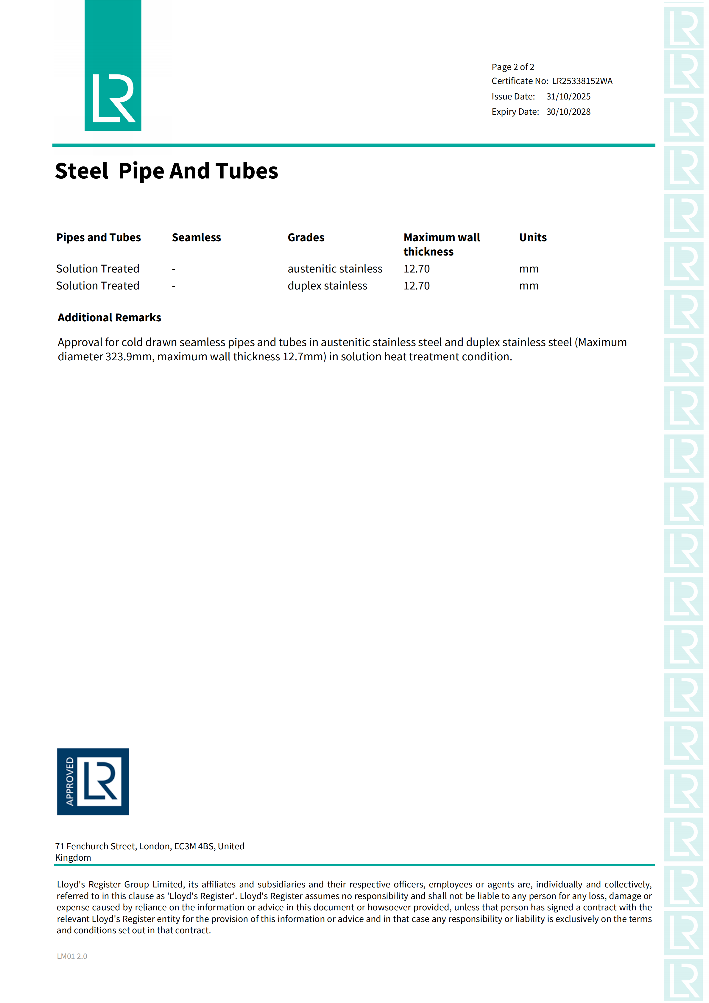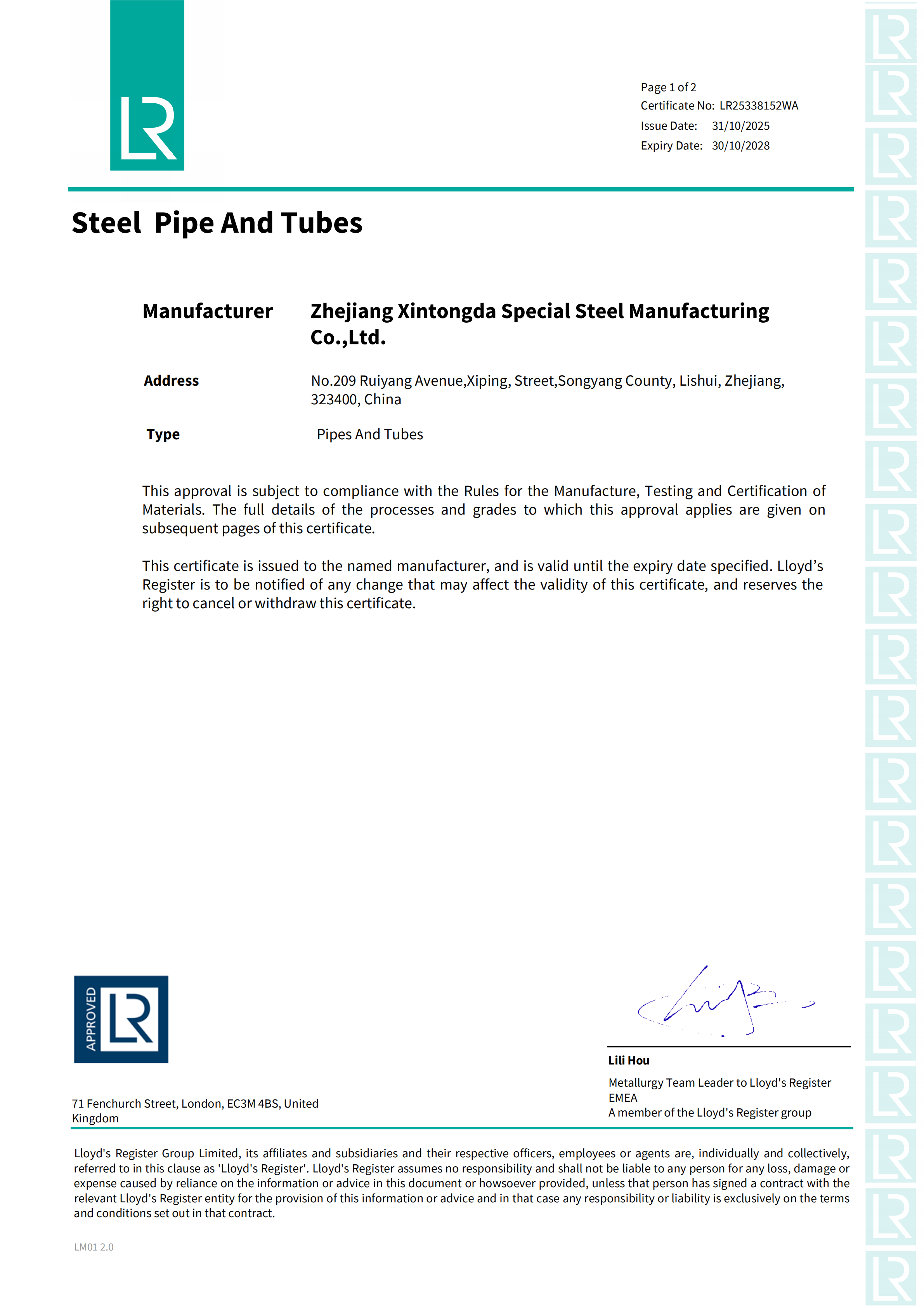 浙江鑫通达深知在关键工业和船舶应用领域,可靠的性能至关重要。秉承“成为世界管道供应商”的愿景,此次劳氏船级社认证进一步增强了我们为船舶行业提供可靠服务的信心。